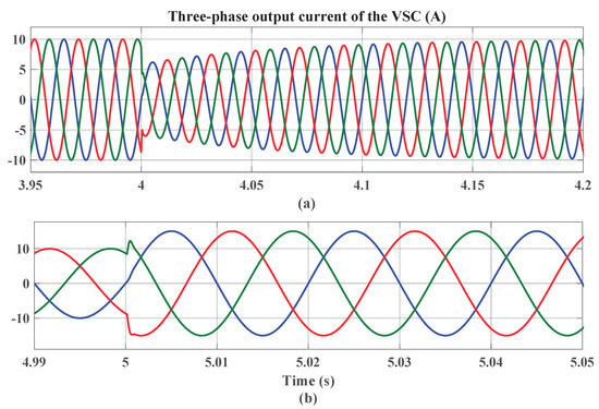 The three-phase output current of the VSC response to the (a) 50% voltage sag in grid-side voltage magnitude, and (b) step change in current reference from 10 A to 15 A.