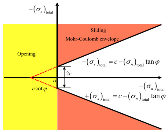 In the above discussion, we have tacitly assumed that the normal stress across a joint element is compressive. According the Mohr-Coulomb condition (Equation (7)), if the stress greater than as shown in Figure 3, another failure model is possible, namely joint separation or crack open. In this study, we assume that natural fractures cannot bear tensile forces. Therefore, if the normal stress on a joint element changes from compressive stress to tensile stress, an opened Mohr-Coulomb element is formed. For such an element, the boundary conditions are that the total normal and shear stresses are zero. In this case, a cracked Mohr-Coulomb element is equivalent to a constant displacement discontinuity element, so the following equations must be satisfied:
