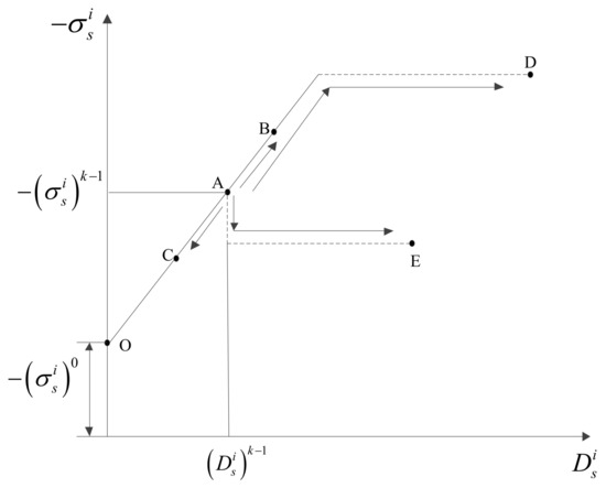 When a joint element satisfies the constraint expressed by Equation (7), it will be called a Mohr-Coulomb element. The inelastic deformation of the natural fracture can be accurately simulated by using this special element. It is required that the element be allowed to undergo a certain amount of inelastic deformation or permanent slip, when the total shear stress on the joint element exceeds the total yield stress. Suppose that loading increment k − 1 has been completed, and no inelastic deformation occurred during this or any previous increment, the total shear stress and shear displacement discontinuity will lie at some point A (see Figure 4). At the next loading increment, the i-th element may load or unload elastically (points B and C), or it may fail in accordance with Equation (1) (points D and E).
