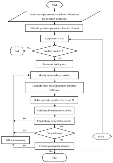 Given the prescribed stress or displacement boundary conditions, Equation (1) is a system of equations with 2N unknown displacement discontinuity components. These equations can be solved by standard methods, either direct or indirect. In this study, an iterative method called the “method of successive over-relaxation” is used. Details are provided in Appendix A.