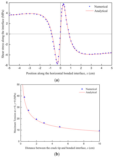 The accuracy of the numerical model is validated by calculating the stress distribution along a bonded horizontal interface just ahead of a vertical opening fracture. The geometry of the model is shown in Figure 6. For simplicity, a uniform remote tensile (5 MPa) is used. The distance between the interface and the fracture tip is s; the vertical fracture length is 2a, which is 1-m-long; Young’s modulus is 20 GPa; Poisson’s ratio is 0.25. The analytical solutions can be easily derived from the Westergaard function (Appendix B).