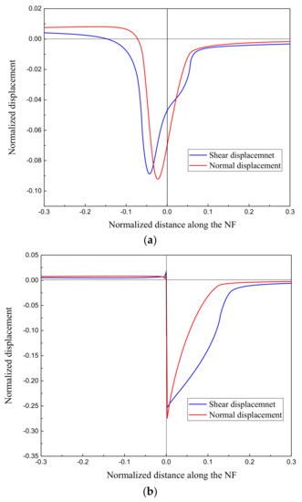 Normalized displacement distribution along the natural fracture (NF). (a) Fractures gap ρ = 0.1 m; (b) Fractures gap ρ = 0 m.