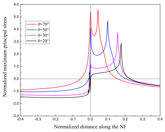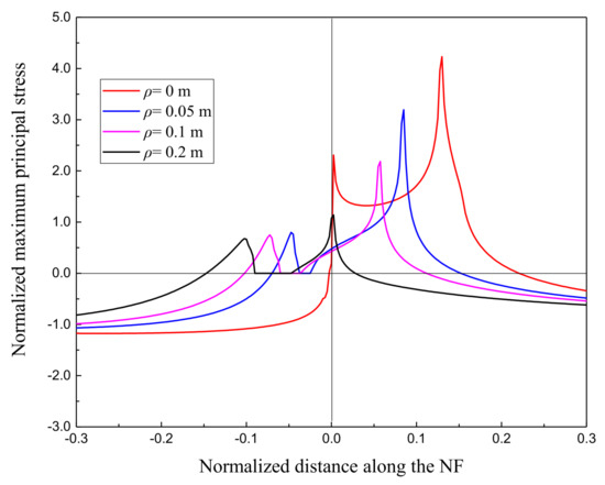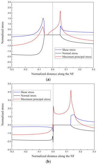 The normalized stresses along the NF are shown in Figure 10. From this figure, we can see that near the center of the NF, there is an opening zone where the shear and normal stresses are equal to zero, and the maximum principal stresses are located at the end of this zone. Meanwhile, the maximum principal stress has two different peak points, and the bigger one is located at the positive side of the NF, so secondary tensile cracks are more likely appear at this location. This result can be confirmed by the field test of Jeffrey [73].