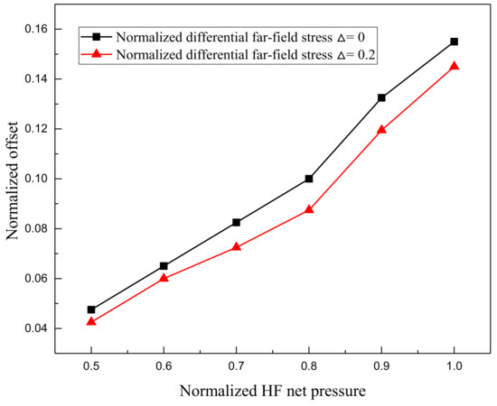 Offsets of the maximum principal stresses as a function of hydraulic fracture (HF) net pressure.