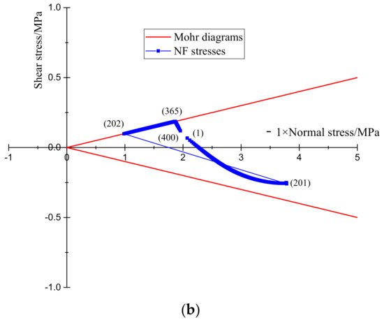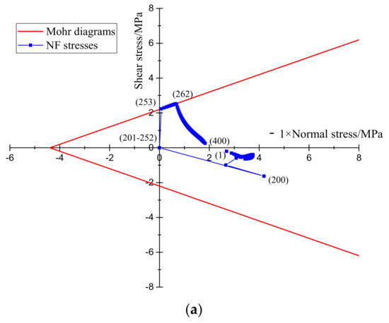 Finally, the cemented strength of NF is being considered. The Mohr diagrams for the entire set of elements along the NF are depicted in Figure 15. The two inclined straight lines in each diagram represent the yield condition and are usually called Mohr-Coulomb envelope lines. The bracketed numbers refer to the element numbers. From this figure, it can be observed that for a moderate strength NF, the shear and tensile damages occur simultaneously. In this case, the elements (No. 201–252) in the range of 0.0 m < y < 0.26 m open, while the elements (No. 253–262) in the range of 0.26 m < y < 0.31 m undergo sliding. However, for a weak strength NF, only shear failure occurs. The elements (No. 202–365) in the range of 0.0 m < y < 0.82 m undergo sliding, which means that the HF is more likely to turn toward the NF direction.