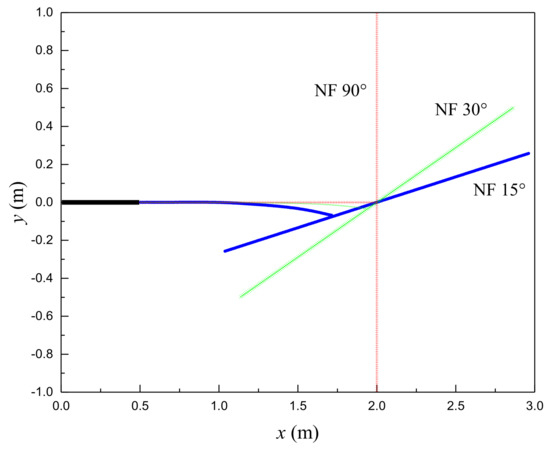 The accurate prediction and monitoring of hydraulic fracturing propagation pathways is very important for reservoir stimulation practice. Therefore, the flowing numerical simulations are conducted to investigate the influence of NF on the HF trajectories. The main parameters required for the model are derived from [44]. One issue that needs to be especially pointed out is that the initial deformation of the natural fracture is also not considered in this case. The HF trajectories for different NF inclination angles are depicted in Figure 16. From this figure, we can see that the NF inclination angle has an important effect on the shape of the HF propagation path. When the NF inclination is 90°, the HF extends parallel to the x-axis until it crosses the NF. However, as the slope angle decreases, the left side of the NF (i.e., y < 0) is closer to the HF surface, and the direction of the maximum principal stress in front of the NF will change. Thus, the HF is more prone to deviate from its original propagation path and reorientation near the NF.