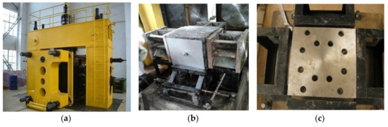 The main devices of the true tri-axial fracturing system. (a) Tri-axial loading system; (b) Force transmission frame; (c) Reserved holes of the acoustic emission (AE) sensor.