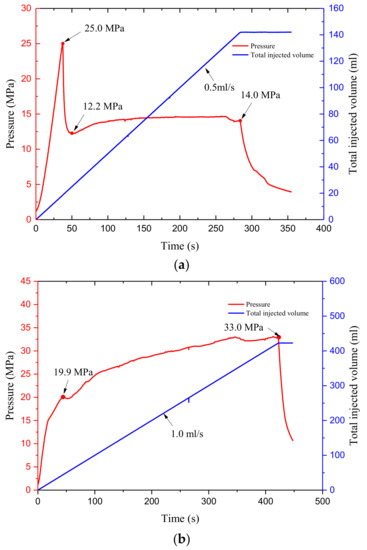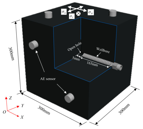 Two cube samples of 300 mm × 300 mm × 300 mm were prepared for these experiments. Each block had a simulated wellbore (diameter: 24 mm; length: 170 mm) in its center, with the axis of the borehole parallel to the minimum horizontal stress. Two slotted steel pipes (diameter: 20 mm; pipe thickness: 2.5 mm) were then cemented with epoxy onto the simulated wellbore, leaving a 5 mm open-hole section at the lower side of the wellbore. The direction of wellbore and in-situ stresses are shown in Figure 18. For each experiment, water with red fluorescent dye was injected into the wellbore. The experimental scheme is shown in Table 2.