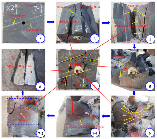 Photographs of the cube after the fracturing tests are shown in Figure 19 and Figure 20. It is found that the geometry of the shale hydraulic fracture is more complex, which is different from the traditionally bi-winged, planar fracture. The morphology of the HF is strongly influenced by the opened NFs and sedimentary beddings.