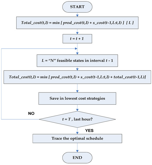 The definition of the dynamic programming in a forward direction is the track or path from one state at a given certain hour to a state at the next hour. The state Xi(t) is the i-th combination in hour t, where N is the strategies’ number to store at each step and L is the states’ number to treat each period. The maximum value of L or N is 2N − 1. In Figure 2, there is a the step by step execution and the flowchart of the dynamic programming method.