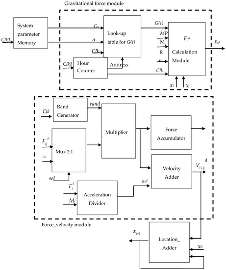 Figure 4 shows the proposal for the FPGA hardware implementation for GSA. It composes of four main modules, system parameters memory module, gravitational force module, force_velocity module, and location adder module. The system parameters memory module is utilized to store all the system initial parameters, which are required for other modules. The gravitational force module composes of lookup table, which stores all values of G(t). The address of this lookup table is delivered from hour_conter. The final block is calculation module, which calculates the value, as indicated in Equation (12). The role of force_velocity module is to calculate both the force and the velocity . As indicated in Equations (13) and (15), a random generator and a multiplier are required to get the values of and . Accordingly, the multiplexer 2:1 in this module allows to use single rand generator and multiplier to calculate both quantities and hence safe more area required. The final main module in GSA is location_ Adder, which responsible for calculating the new location , which is defined by Equation (16).