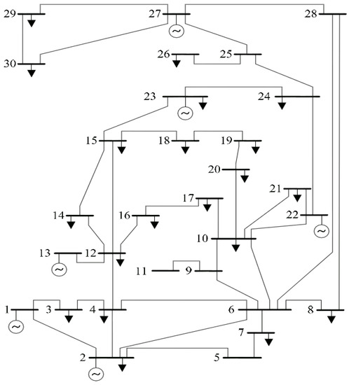 IEEE 30 bus system. Note: Generators are on buses—1, 2, 5, 8, 11, and 13.