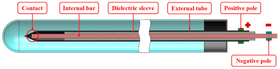 The absorber is designed starting from a 3D optic-thermo-fluid dynamic model. There is no reference to verify its real performance numerically because the adopted technical solutions are not standard. Consequently, a specific test bench should be set up; an off-Sun mode analysis is considered in order to distinguish the different physical phenomena. Because of the small size of components and the novel inlet/outlet configuration, the layout proposed in [9,19,20,21] was not suitable in this case: for instance, there is no place to insert many sensors and more than one cartridge heater to guarantee uniform temperature along the absorber. Therefore, a novel testing method is proposed as shown in Figure 2: the internal pipe is replaced with a copper bar, which is insulated by a dielectric sleeve. However, the end of bar is supposed to be in contact with the external tube to create an electrical circuit so that two different poles (negative and positive) could be located at the beginning of the system. In this configuration, Joule effect could be generated directly using a dual power supply (controlling current and voltage separately).
