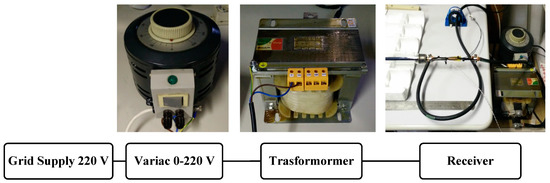 The copper bar used should have a similar electrical resistance as the receiver (similar geometric section and material) in order to amplify the heating effect and keep it uniform alongside the absorber tube. However, the global resistance is expected to be in the order of mΩ that means the power would be supplied at very high current (hundreds of Amperes) and low voltage (near unitary). Since no laboratory device is able to supply this condition, it was necessary to provide a specific power generation unit, an alternative current loop (AC-Loop), based on a transformer (1200 W at 2.5 V and 500 A). Furthermore, a Variac should be used to accurately regulate the voltage to the transformer input (Figure 3).
