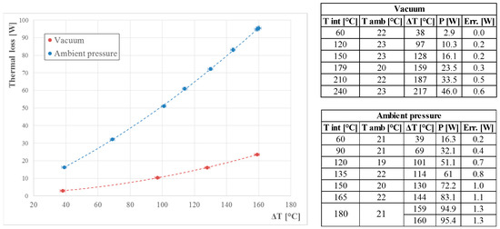 In Figure 6 thermal loss is shown as a function of the difference between receiver internal temperature and ambient temperature. The variation from vacuum to ambient pressure condition (the same tube is used) seems to be consistent; the maximum loss reaches 23.5 W in the first case, while it rises up to 95.4 W in the other one, at 180 °C. In other word, the thermal loss under ambient pressure conditions is four times higher than under vacuum conditions.