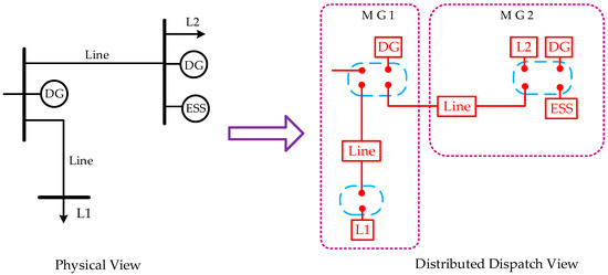 The fully distributed optimization method includes two broad categories, i.e., the Lagrangian relaxation-based and the optimality-condition decomposition-based category. The Lagrangian relaxation approach formulates the Lagrangian function and then solves the subsequent dual Lagrangian relaxation problem by two steps in an iterative process: (1) decomposition of the relaxed primal problem with given multipliers; and (2) update of multipliers. Note that the multiplier-update technique commonly includes the subgradient method, cutting-plane method, bundle methodm, and trust-region method. Readers can refer to Reference [12] (Chapter 5) for details. To enhance the convexity of the relaxed primal problem and improve the convergence, a quadratic penalty term is conventionally added in formulating an augmented Lagrangian function. The auxiliary problem principle is then employed to linearize the augmented Lagrangian function so as to decompose the relaxed primal problem into several subproblems, which is thus called as augmented Lagrangian decomposition [13,14]. In addition, similar to augmented Lagrangian decomposition, the analytical target-cascading method generally decomposed a system into a multilevel hierarchical structure through introducing penalty functions to model autonomous interdependencies [15]. The penalty function is usually modeled as an augmented Lagrangian block coordinate-descent formulation or exponential penalty function, which consequently brings many parameters to be tuned. The optimality condition decomposition-based approach is initially proposed for solving large-scale nonlinear and possible nonconvex problems in Reference [16]. Specifically, it solves the first-order Karush–Kuhn–Tucker conditions in a distributed manner. Similar to optimality-condition decomposition, a heterogeneous decomposition is presented in Reference [17] to solve the optimal power flow for transmission and distribution systems. Reference [18] improves the convergence of optimality-condition decomposition by adding a correction term in the update process. However, the convergence conditions of optimality-condition decomposition are still not easy to verify for practical applications.