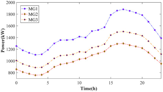 Figure 5 illustrates the power procurement from the main grid for three microgrids, and Figure 6 demonstrates nodal-voltage magnitudes at representative buses—3, 16, and 30. Energy procurements for the three microgrids increased during peak load hours (i.e., 11:00–20:00), which corresponded to significant voltage drops at the selected buses. Note that there was a sharp drop of voltage magnitude at bus 16 during 14:00–15:00. This is mainly because the photovoltaic output power at bus 16 substantially decreased at the corresponding period. Similarly, there was a slight increase of voltage magnitude at bus 16 during 22:00–23:00, and photovoltaic output power at the same bus went up correspondingly.