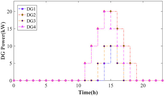 Figure 7 shows that fuel-based DGs would operate during energy-price peak periods because less energy was bought from the main grid at higher prices. DGs at buses 17 and 32 would operate at 11:00, while DGs at buses 4 and 23 within microgrid 1 started up at 13:00 and 14:00, respectively. This is reasonable because the locational marginal prices at buses 17 and 32 (more remote from the slack bus) were comparatively higher than those at buses 4 and 23, primarily due to network loss and voltage-magnitude limit. Once the locational marginal price was higher than the average cost of fuel-based DGs, the operator would rather increase the output power of fuel-based DGs. Thus, as shown in Figure 8, the DGs at buses 17 and 32 worked for more periods than DGs at buses 4 and 23.