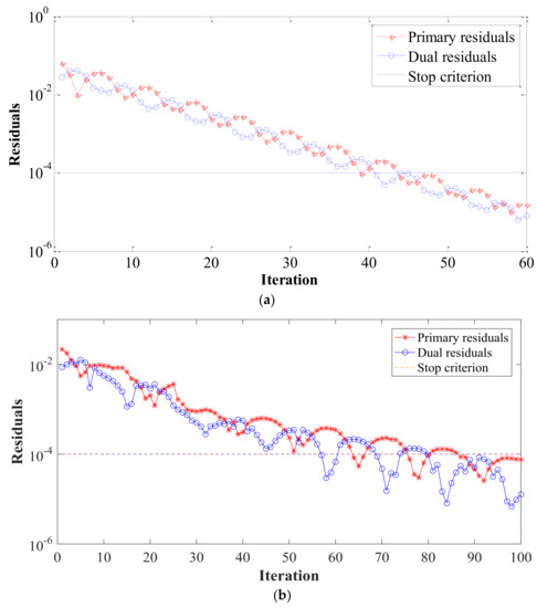 As the proposed solution method represents a version of ADMM and the established model is convex, this method can guarantee a global optimal solution to be attained. To determine the termination criterion, two types of residuals [35], i.e., primal and dual, are introduced and denoted by rk and sk for the k-th iteration, as formulated by:
