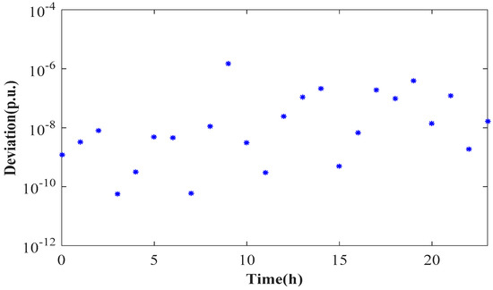 where devt denotes the maximum residual of the square of the current magnitude in all distribution branches. Evaluation results are shown in Figure 9, wherein the defined evaluation index for the whole optimization horizon was less than 10−6. More importantly, it was remarkably less than the square of the current magnitude. Therefore, the SOC-relaxation technique can offer a theoretically optimal solution with high computation speed.