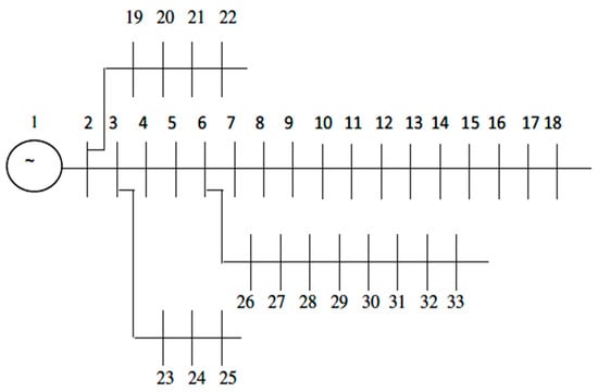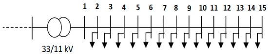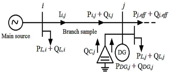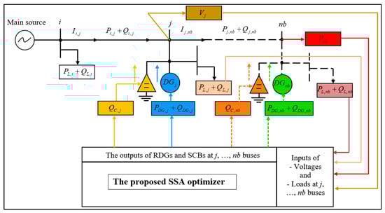 The sample of a RDN with the installation of RDGs and SCBs is shown in Figure 1. The Back-ward/Forward Sweep (BFS) technique was carried out for power-flow evaluations [9,25,28]. A distribution network diagram is explained in Figure 1. The evaluations of the BFS power-flow were considered with new parameters that were implemented in this article, such as (active power of RDGs “0/1” set), (reactive power of the SCB “0/1” set), and (reactive power of the RDG “0/1” set) as follows: