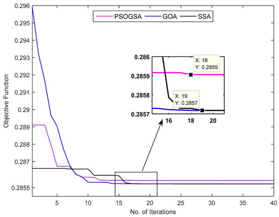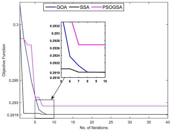 In this regard, the main steps of the SSA methodology are demonstrated in Figure 2. The SSA technique begins the optimization process by initializing multi-salps via random sittings. Consequently, it evaluates the fitness of every salp, discovers the salp via the best fitness, and assigns the position of the best salp to the variable F as the source food to be chased by the salp chain. Meantime the coefficient c1 is updated using Equation (53). For each dimension, the position of leading salp is updated using Equation (52) and the positions of the follower salps are updated utilizing Equation (54). If any of the salp goes outside the search space, it will be brought back to the boundaries. Note that the salp population’s xi are considered as the active and reactive power of the RDGs and SCBs, and nb are the node numbers. All of these strides without the initiating phase are iteratively performed until the satisfying of an end criterion. However, the food source will be renewed within the optimization operation inasmuch as the salp chain is likely to get a better solution by exploring and exploiting the space around it. The salp chain has the potential to go forward to the most favorable solution’s global-optimum, which modifies along the iterations [39]. The adaptive operation of SSA permits the avoidance of local solutions, and lastly discovers an accurate evaluation of the best solution obtained within optimization operation.