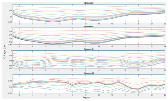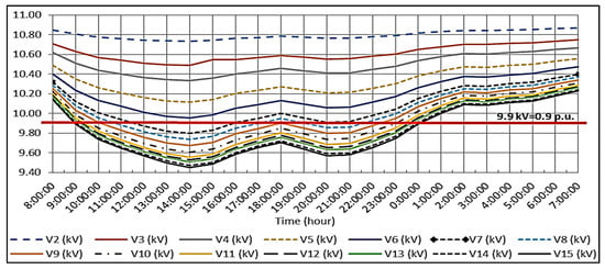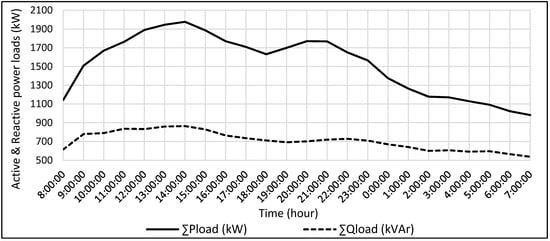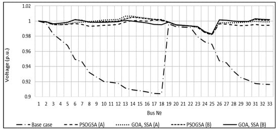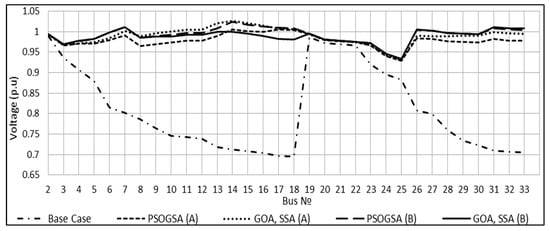 Electric power networks, especially distribution systems, commonly suffer from two main issues: high power losses and poor voltage profile [1,2]. The losses in the transmission/distribution grids produce the biggest exhaustion in power systems [3]. Accordingly, the loss of distribution grid is concerning and this has attracted many studies in the distribution schemes field, which have concentrated on line loss decreasing and voltage control. Diverse methodologies of loss minimization and voltage level boost in the distribution system are considered in two solutions like (i) shunt capacitor bank (SCB) locating, and (ii) distributed generator (DG) installations These are more focused on achieving interconnection when small generators exist; for instance, when isolated wind farms or small photovoltaic plants enter the distribution network [3]. By tradition, loss decreases and voltage profile improvement have focused on optimizing the reactive power using a capacitor bank. While the growth from inactive distribution grids into active distribution grids because of the integration of the distributed generator (DG) introduces big changes, in spite of this, parallel-converters being used to connect DGs to the grid can increase the power loss [4,5]. This work incorporates the optimization approaches for enhancing voltage levels; minimizing the distribution losses and the whole operation costs by capacitors compensations, and the integration of RDGs. The optimum integration of renewable distributed generators (RDGs) and their impacts are always a hot topic for solving the major problems of electric power systems (e.g., poor power quality due to degradation in voltage levels, high system losses, low of reliability causing power system blackouts, and congestion in transmission systems) due to a wide range of load growth and investment shortages in transmission networks. The definition of RDGs can be deduced as the electricity generation from renewable generating units that are adequately smaller than central generating plants or the substations, allowing for connections at almost any point in a power network [3,6,7]. A wide range of benefits are achieved by the integration of RDGs in power grids including environmental, economical, and technical, which encourage distribution companies and consumers sufficiently to enlarge investment in the renewable generation field [8,9,10]. The environmental and economic merits are deduced in sufficiently minimizing the transmission and distribution costs, and the prices of electricity [11,12,13]. The optimal installation and capacity of RDGs and SCBs simultaneously on radial distribution networks (RDN) are immensely hot topics. It is a magnificent challenge for power system researchers and planners, due to the fact that the profits that are gained from savings and technical issues can be increased extremely with the separate operation of RDGs and SCBs. Moreover, on account of the complication and divergence of the distribution grids, modern and efficient methodologies are required to assure the power quality (PQ).