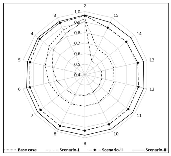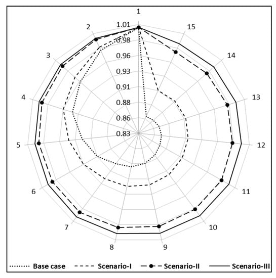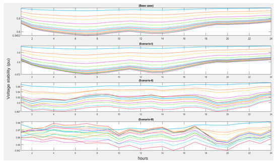 The voltage stability is one of volt is the capability to maintain the voltage and delivered power to loads by the system with an increase in nominal loads. Therefore, the voltage and power transmittance are controllable. If the capability of maintaining voltage and power transfer in the system is lost, the voltage is unstable, which leads to the voltage collapse process. Moreover, the power system will step inside a period of voltage instability before the voltage collapses. Therefore, with the continuity of voltage instability, the control of system voltage and power flow has been lost by system operators. The reverse supplies of the system reactive power will be exhausted, and the motors may begin to stall. According to this, voltage collapse may happen, if voltages decline any more [30]. In this regard, to avoid these problems, it is important to study the impact of installing devices such as SCBs and RDGs on voltage stability in the distribution network. To measure the voltage stability of the system, the Voltage Stability Index (VSI) is proposed [30].