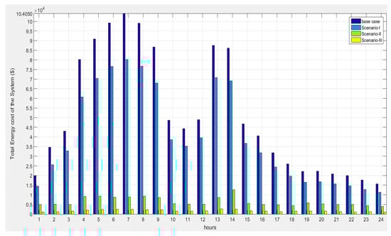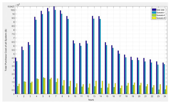Minifying of the whole operational-cost can be deemed as one of the merits of locating the RDGs and SCBs in the RDN. The whole operational-cost via the integration of RDGs and SCBs includes four components. (I) the whole operational-cost of SCBs in (22); (II) the whole operational-cost of RDGs as in (25); (III) the purchased cost of the RDN covering losses via integrating RDGs and SCBs. Consequently, (18) is reformulated to be the purchased cost () of the grid via RDGS and SCBs; (V) is the whole energy cost via locating the RDGs and SCBs as in (13).