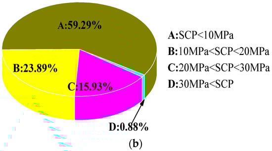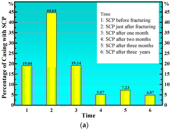 Natural gas may often migrate to the surface through the annulus or the channels among the cement sheath. Especially in the horizontal shale gas wells which are gone through hydraulic fracturing, most of the wells show sustained casing pressure (SCP) to some degrees. Based on the field data from shale gas wells in China, the change in the number of the wells with sustained annulus pressure during the whole life of the shale gas wells are shown in Figure 1a [15]. It can be seen that the percentage of wells with SCP has significantly increased from 19.04% before hydraulic fracturing to 63.70% after the hydraulic fracturing treatment. While 19.14% of wells show SCP after one month, 5.07% more wells show SCP after two months. The pressure in the annulus of shale gas wells in this area are also measured, and the results are shown in Figure 1b [15].