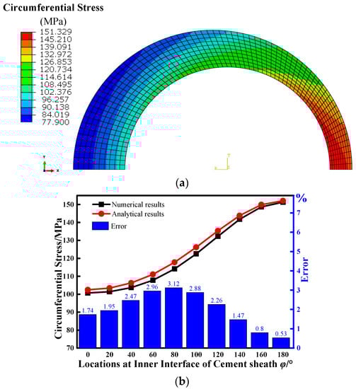 (a) FEA results for the circumferential stress on the inner interface of the cement sheath; (b) comparisons between ABAQUS numerical results and analytical results.