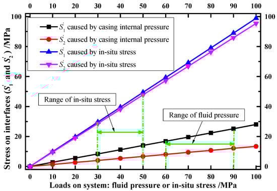 Hydraulic fracturing treatments and other operations can increase fluid pressure inside the casing, the interface of the casing is pushed outwards to the cement sheath by the casing internal pressure and causes stress changes on the inner and outer interface of the cement sheath. In this section, the effect of the fluid pressure is only considered. The fluid pressure is assumed to be 50 MPa and no crustal stress. The stress on the first interface is 14.0 MPa and S’2 on the second interface is 6.7 MPa according to Equation (1) using parameters of Table 1.