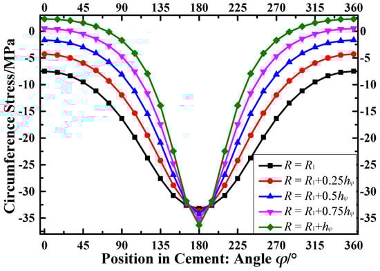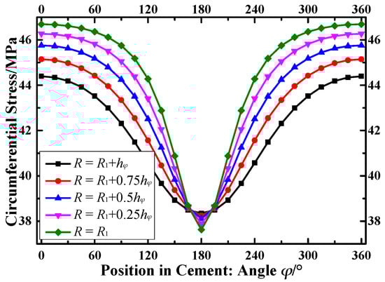 As shown in Figure 4, the positive direction of the x-axis is set as the start line and φ is the angle between the x-axis and the location vector of point M. When the angle φ is smaller than 180°, the thickness of the cement, hφ, decreases with the increase of φ. The stress in the cement sheath along circles with different radii is calculated using Equation (A9) as shown in Figure 7, where the thickness of the cement sheath hφ is divided into four parts: R1 is the inside radius of cement sheath and R = R1 + Bhφ (B = 0.25, 0.5, 0.75, 1) is the radius of the circle where the circumferential stress of point M is calculated. The eccentricity δ (also the distance of the casing center from the borehole center, see Figure 4) is 0.025 m and, the thickness of cement sheath is ranging from 0.0163 m to 0.0663 m. Figure 7 shows circumferential compressive stress in the cement sheath by only considering the crustal stress. In accordance with the previous study about the stress in the cement sheath with no eccentricity [1], the largest circumferential stress is at the inner interface of the cement sheath and with the increase of the distance from the casing, the circumferential stress decreases. Meanwhile, the circumferential stress decreases with the increase of angle φ, and then the stress increases after the φ is larger than 180°. This means that when the crustal stress is only applied on casing–cement–formation system, the largest stress is located at the thickest part of the cement sheath. The maximum circumferential stress is 46.7 MPa and the lowest circumferential stress is 37.6 MPa. The circumferential stress at the inner interface of the cement calculated according to Equation (1) is 45.5 MPa when the thickness of the cement is uniform (no eccentricity).
