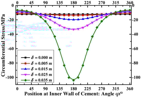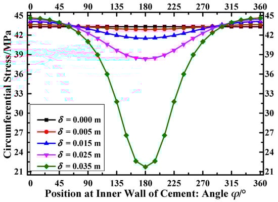 Considering fluid pressure inside the casing, the effect of eccentricity, δ, on the stress in the cement sheath can be analyzed. At different eccentricity, the stress can be calculated according to Equation (A14) and the variations of circumferential stress are shown in Figure 11, where eccentricity is0 m, 0.005 m, 0.015 m, 0.025 m and 0.035 m.