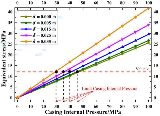 Variation of equivalent stress with the increase of casing internal pressure in different eccentricities, δ.