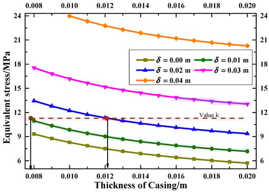 The thickness of the casing string may affect casing resistance against collapse and debonding. We assume that casing thickness can range from 0.008 m to 0.02 m, here. The inside diameter of the casing is set as 0.116 m and the average thickness of the cement sheath is set as 0.065 m. The crustal stress is 35 MPa and the wellbore pressure is 75 MPa. The eccentricity is assumed to be 0.00 m, 0.01 m, 0.02 m, 0.03 m, 0.04 m. Other parameters of the casing, cement and formation are shown in Table 2. The variations of equivalent stress with the casing thickness are shown in Figure 13.