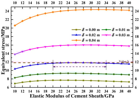 The effects of the elastic modulus on the stress in cement sheath are calculated according to the Equations (A11)–(A13) and the results are shown in Figure 15, where the elastic modulus of cement is ranging from 10 GPa to 40 GPa [23]. The thickness of the casing is 0.012 m and the outside diameter of the casing is 0.139 m. The thickness of the cement sheath is set as 0.065 m. The eccentricity is as assumed to be 0.00 m, 0.01 m, 0.02 m, 0.03 m, 0.04 m. The crustal stress is 35 MPa and the fluid pressure in the casing is 75 MPa. From Figure 15, we can see that the effect of elastic modulus on equivalent stress in the cement is much smaller than the effect of the thickness of cement and casing, so using different cement grading is not recommended for this purpose.