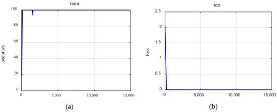 Figure 6 and Figure 7 show the accuracy and loss function curves of the training and the test data, respectively. From Figure 6 and Figure 7, it can be seen that both the accuracy curve and the loss function curve fluctuate little during training and testing. In addition, the convergence speed is fast, and the convergence value is ideal.