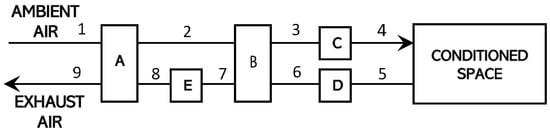 The air coming from the air-conditioned space is directed to the exhaust, where it undergoes several psychrometric processes starting with cooling in an evaporative cooler (5→6). This brings the air close to the saturation line with humidification. In the energy-recovery wheel, the air is preheated (6→7) before it passes through the heater (7→8), where its temperature is further raised so that it will be able to desorb the water from the desiccant on the regeneration side of the desiccant wheel (8→9). The regeneration heat source (E) can be either a solar thermal system or waste heat.
