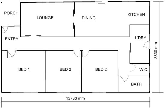 To have an idea as to how a desiccant evaporative cooling system serves a house built in the Brisbane climate zone, a house, of which the floor plan is shown in Figure 2, has been modeled. The floor plan of the house is adapted from the “Example” house in Cheetah program [20], used in References [21,22]. The house consists of three bed rooms, one lounge, and one dining room/kitchen. A passage connects the bedrooms from the lounge and dining space as shown. The laundry room and bathroom (called service section) are located close to each other at the right side of the building space. The height of the building was set to 2.4 m and the two roof sections, facing north and south, respectively, have 25° pitch.