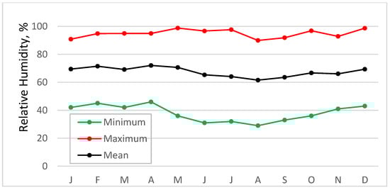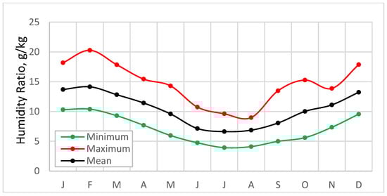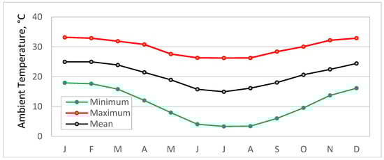 According to TRNSYS weather data used in the model, Brisbane has an annual maximum temperature of 33.2 °C and a minimum temperature of 3.4 °C, with an annual mean of 20.5 °C, Figure 3. As expected, the maximum occurs during the four summer (or warmer) months of January, February, November, and December. Cooling can be expected to occur with less frequency during transition periods to and from winter. The winter months of May to August are practically free from cooling demand when some heating is needed. In terms of humidity, typical of subtropical climates, Brisbane is relatively dry, although some dehumidification is required during the summer months. The information processed from the TRNSYS weather data (Figure 3, Figure 4 and Figure 5) is very close to that reported in Reference [15].