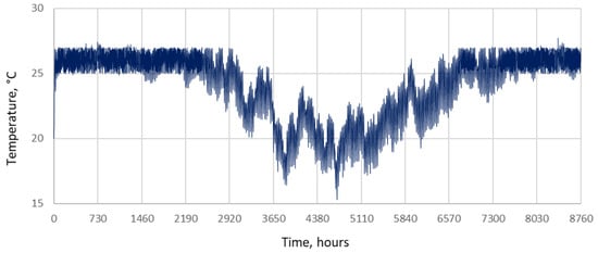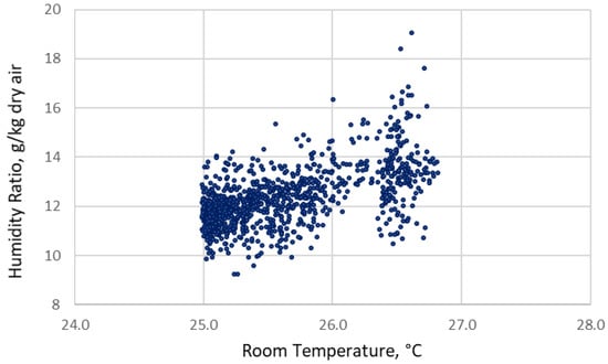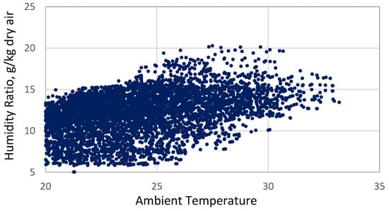 Figure 6 shows the plot of the humidity ratio against the dry bulb temperature of air in Brisbane during the cooling months. As shown, the number of points where humidity ratios are below ASHRAE’s upper recommended value and that lie between 20–26 °C are quite significant. In such a situation, mechanical cooling is not required and, as discussed in Section 4.3.4, the economy cycle is not required, either. However, the same figure also shows that mechanical cooling is required for a significant number of hours during the cooling season.