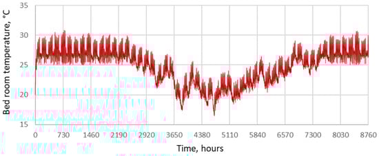 Living-room and bedroom temperature profiles are shown in Figure 7 and Figure 8. As shown, during the conditioning periods, temperature in both types of room stays at around the room-temperature set point of 26 °C (±0.5 K). The peaks in the profile indicate the temperatures where the zone (bedroom) is not conditioned.