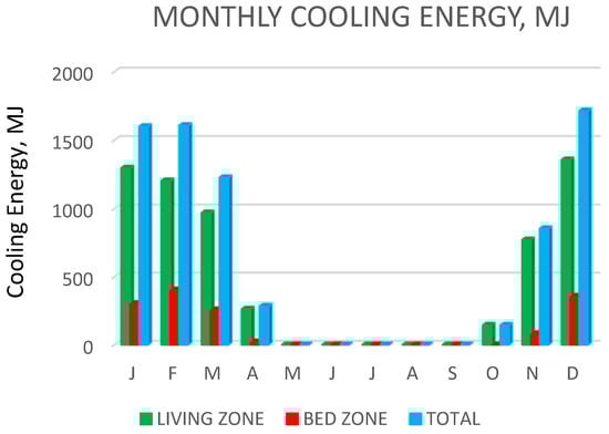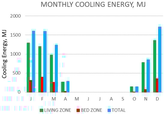 When temperature of the outside air is significantly less than the room temperature, and when outside humidity levels are acceptable, then the economy cycle can be considered for reducing the cooling energy provided to the conditioned space [26]. In this exercise, the economy-cycle control strategy is based solely on the temperature of the outside air. The use of humidity sensors in economy-cycle strategies is possible [26], but it may be impractical. In this case, the economy cycle is activated when the ambient temperature is 20 °C or below, as in Reference [26]. Figure 14 shows cooling-energy demands when the economy cycle of the system is activated. As shown, there is insignificant reduction of cooling-energy demand on a monthly and annual basis compared to the normal operation of the system. As expected, most (in fact: all) economy-mode occurs during the night when bedrooms are being conditioned.