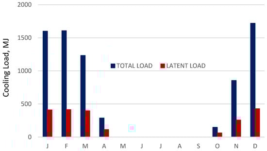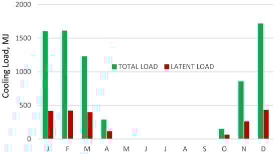 Monthly total and latent cooling demands for the house (economy cycle mode).