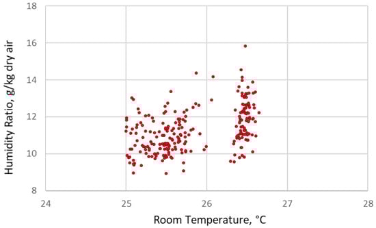 Shown in Figure 12 and Figure 13 are plots of humidity ratio vs dry bulb temperature for living room and bedrooms, respectively, during the times of cooling demand while the system is operating. As shown, only for around 50% of cooling hours for the living room does the humidity ratio fall within the comfort boundary, i.e., below 12 g/kg dry air as recommended by ASHRAE [23] while the rest falls beyond the upper boundary. The upper value of humidity ratio is for the room expected to be conditioned by a conventional refrigerative system where the air velocity is below 0.1 m/s. In the room cooled by an evaporative cooling system, the cooling effect from higher room air velocity compensates for slightly higher humidity. However, although the system under study has an evaporative cooling component, its air conditioning (i.e., cooling and dehumidification) capability should be expected to be similar to conventional refrigerative systems. In Figure 13, the number of data plots is much less than that in Figure 12. This merely indicates that, during bed-time cooling, the number of hours where cooling is active is lower compared to that for the living room.