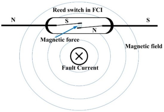 FCIs mounted on buses, underground cables, or overhead lines have been widely installed in distribution systems for fault indication. The fault indication functions and practices are introduced in this section. FCIs usually use reed switches for fault detection []. The application of a reed switch for the proposed FCI is illustrated in Figure 1. With the fault current flowing through a conductor, the magnetic field of the conductor will trigger the reed switch and result in the change of a mechanical flag and/or the flash of a Light-Emitting Diode (LED) in the FCI for fault indication.