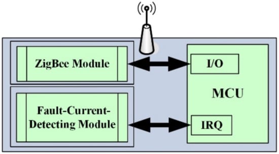 The hardware architecture of a ZigBee-based FCI as illustrated in Figure 2 can be divided into the ZigBee module, fault-current-detecting module, and Micro-controller Unit (MCU). Two magnetic reed switches, abbreviated as SW1 and SW2, and Interrupt Request (IRQ) in MCU are used to detect abnormal and normal currents, respectively. SW1 and SW2 switches with higher and lower triggering currents such as 1000 A and 12 A, respectively, are commonly used. The operational stages of a ZigBee-based FCI are as follows: