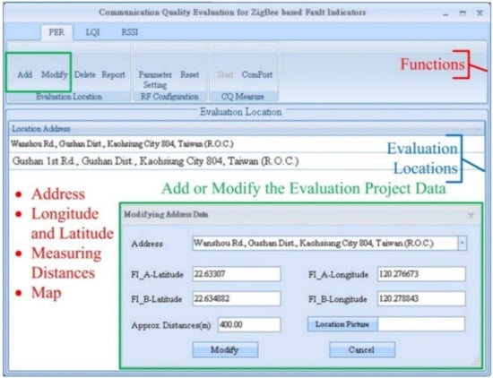 The deployment guidelines for the ZigBee network can be found in the literature [,,,,]; however, the network deployment for actual distribution systems needs further investigation to make sure that the communication performance is acceptable before device installation. A communication evaluation platform using Google Maps to inspect the terrain and possible obstacles for the ZigBee-based FCIs is shown in Figure 4. The proposed platform can select the candidate locations for FCI placement and conduct actual field tests. The communication parameters including Packet Error Rate (PER), Link Quality Index (LQI), Received Signal Strength Indicator (RSSI), etc., can be measured and recorded in the proposed platform for further investigation. The RSSI is the approximately received signal power in the bandwidth of an IEEE 802.15.4 channel. The LQI measures the received energy level and/or signal-to-noise ratio for each received packet. The communication performance can be assessed from the measured communication parameters. Figure 5 shows the Human–Machine Interface (HMI) of the proposed communication performance evaluation platform.