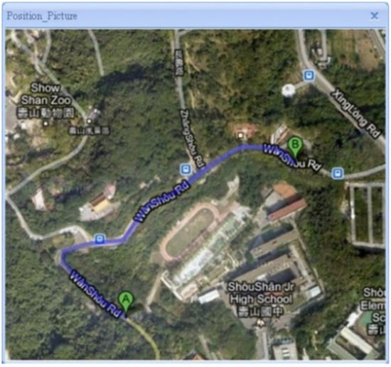 Figure 6 shows the Google Map of the address in Figure 5 after the “Location Picture” button was pressed. The Google Map street view was used to examine the possible terrain and obstacles and select the candidate locations. The communication parameters including PER, LQI, and RSSI, etc., between these two locations could be measured and recorded after the candidate locations for FCIs were selected. If the communication performance is not acceptable, the locations can be modified, and the field tests can be conducted again until acceptable communication performance between two adjacent FCIs’ locations is achieved. Although PER, LQI, and RSSI can be measured and recorded, only the measured PER is used to evaluate the communication performance of the FMS. PER can be converted to PSR, commonly used to judge whether the signal transmission has succeeded, and integrated into the communication performance evaluation of the FMS. The PSR can be expressed as: